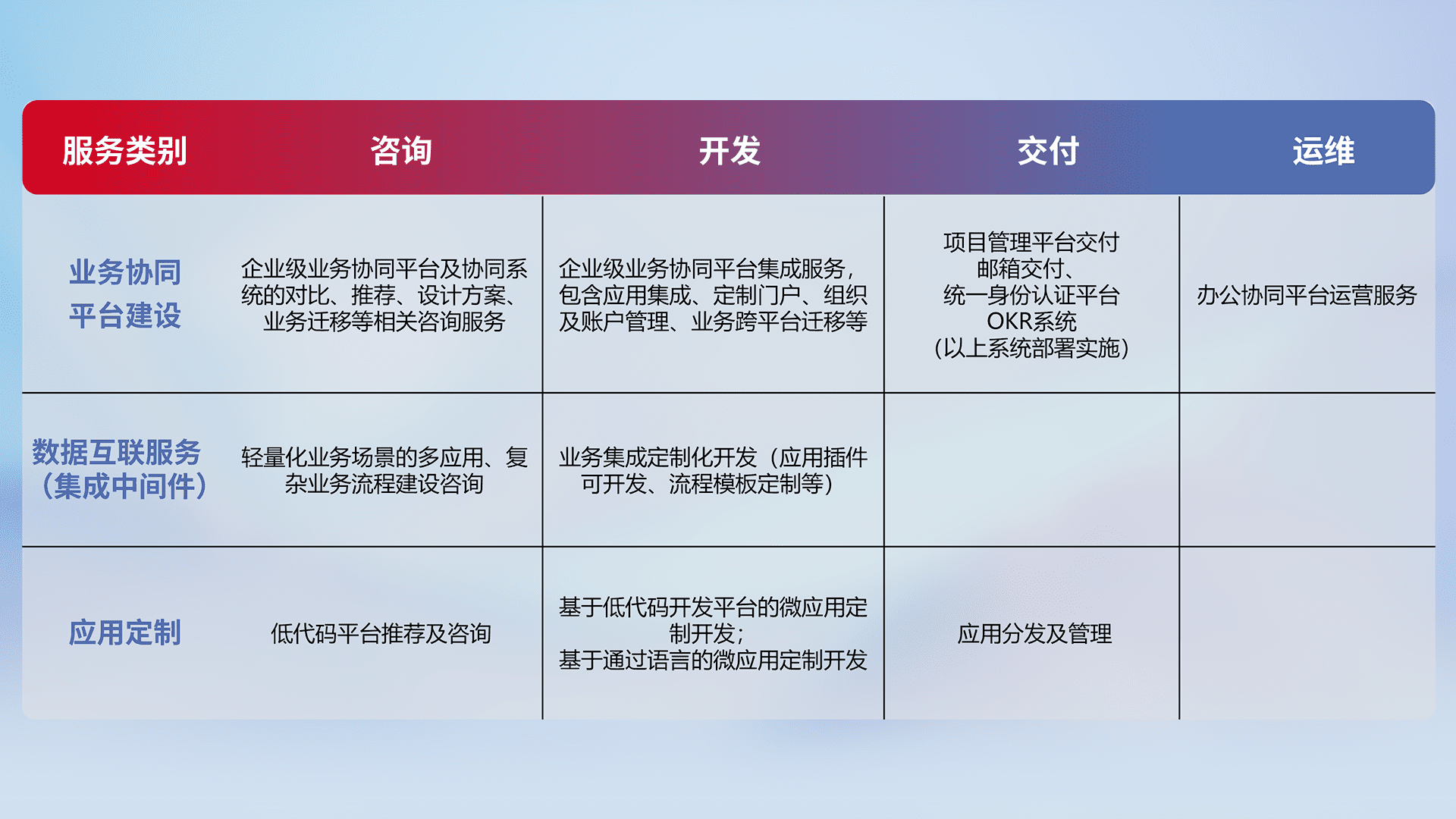 针对钉钉、、、、企微、、、、IDaas等平台级产品提供产品的规划、、、、方案、、、、交付、、定制化开发等服务,,,实现如统一协同办公、、、、智能客户服务、、混合会议管理、、智能数据查询、、、等业务场景,,,实现数字化转型。。