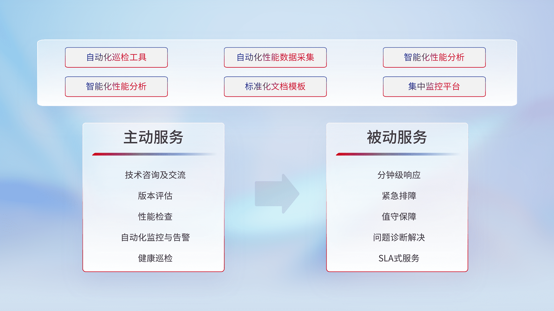 智能化工具和标准化文档,,,保障服务质量,,,,提供主动服务(包含技术咨询、、版本评估、、、性能检查、、自动化监控与告警、、健康巡检)和被动服务包含(分钟级响应、、、紧急排障、、值守保障、、、、问题诊断解决、、SLA服务)。。